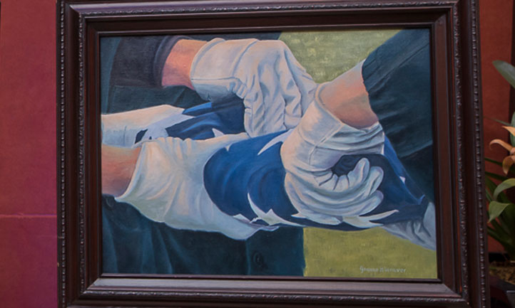 With each painting completed, I captured Todd’s life and his death. I began to feel strength and resolve. It took me close to a year to build up the courage to paint the female notifying officer at my door that morning of September 9, 2010. Memories had raced through my mind that morning as I stood frozen in my tracks, alone in the house, unable to move forward to the door. The painting needed to encompass all of those raw emotions.