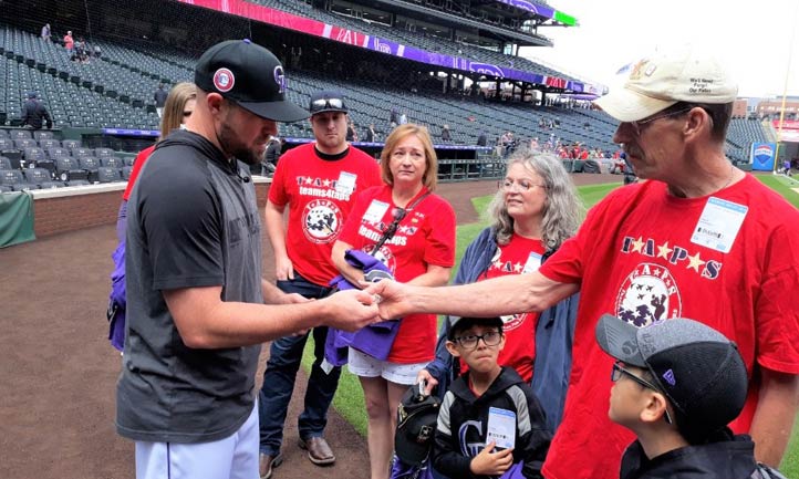 Robert Wichmann, TAPS peer mentor and surviving father of U.S. Army Sgt. Grant Arthur Wichmann, was one of 10 TAPS family members who attended the Colorado Rockies Memorial Day game courtesy of relief pitcher Mike Dunn and the Rockies organization. He presented Dunn with a TAPS coin. “I met the families of two other servicemen, and we shared the joy of their lives with each other and with members of the Rockies organization.”
