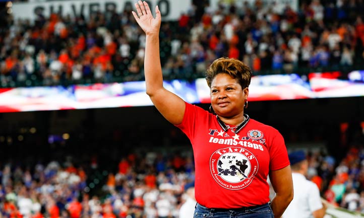 The Houston Astros saluted ten of our nation’s fallen heroes and their families on Memorial Day, even live streaming it via Facebook, so fans at home could watch. TAPS families lined up on the 1st and 3rd baselines while their loved ones names and photos were shared on the jumbotron at Minute Maid Park. Waving to the crowd is Kendra Wilson-Hudson, surviving sister of U.S. Army Sgt. 1st Class Donald La'Shon "Shon" Wilson. Photo courtesy of the Houston Astros.
