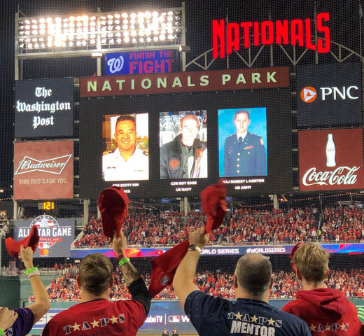Since my essay was written and published in TAPS Magazine, we had the unforgettable, once-in-a-lifetime experience of getting to go to the World Series Game 3 in Washington, D.C. After the third inning, my family and two other military surviving families, along with a few TAPS Military Mentors, had the gift of standing in front of the stadium while a special tribute was made to honor our beloveds. Their pictures were displayed on the Jumbotron and the entire stadium waved their hats to us in love and support, recognizing the service and sacrifice our loved ones have made for our country. The positive energy we received from the crowd that filled the sold-out stadium that evening was incredibly life-affirming.