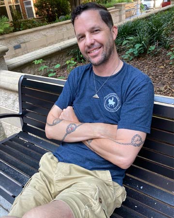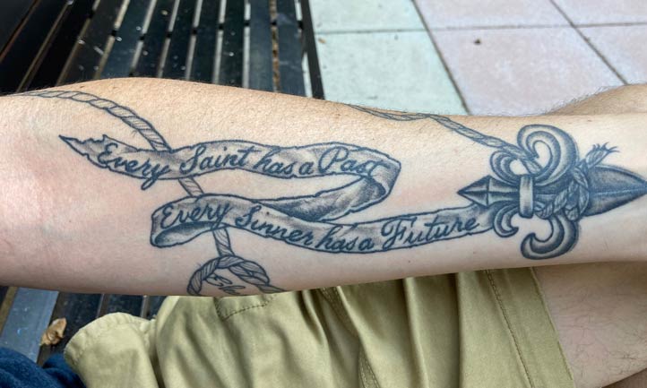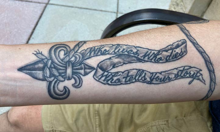 Symbolism abounds throughout this piece of art, and I’m very grateful to the artist for bringing my vision and purpose to life. The tattoo begins with a fleur-de-lis on each wrist. This is my favorite symbol in the world, and it often connotes family, camaraderie, and hospitality. On my right arm and tied to this symbol is a ribbon that reads, “who lives, who dies, who tells your story.” This is both a nod to the greatest musical of my lifetime, maybe ever — “Hamilton” — and also a perfect summation of the entire purpose of this tattoo. I’ve decided that I will tell the story of these TAPS kids and the loved ones they’ve lost from this day until my last day.