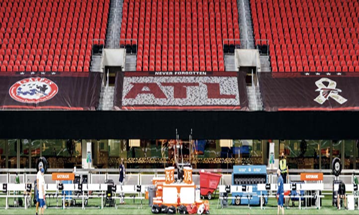 The Atlanta Falcons “Never Forgotten” banner inscribed with the names of the 280 Fallen Heroes honored at their 2020 Salute To Service game at Mercedes Benz Stadium. Photo Credit: Atlanta Falcons Staff Photographer