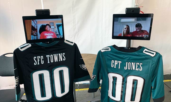 In their first team Salute to Service event with TAPS, the Eagles came up with a novel idea—using robots for the TAPS Families to “attend” practice. The robots allowed the families to be on the sidelines and for the Eagles players to make virtual visits. The Eagles wore Fallen Heroes decals on their helmets during the game; the Defense wore RT for SFC Towns and the Offense wore JJ for CPT Jones.