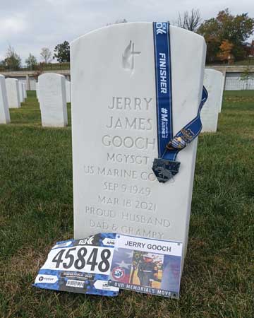 Sitting at Dad's graveside at Arlington National Cemetery, I took a breath and looked around. I could hear the announcer's voice from the finish line at the Marine Corps Marathon on Sunday, October 29, 2023. I carefully undid the safety pins from my Team TAPS racing shirt and removed my race bib and laminated photo of Dad. I propped both up against the tombstone. Then I took off my 10K finisher's medal and draped it on top as my husband sat quietly next to me. In my mind, so many thoughts were rushing around. "I finally made it to this race...I ran past your old work...I ran past the cemetery...finished with the Marines, Dad...I was at the Iwo Jima memorial...I wish we could have done this together...I ran this for you.”