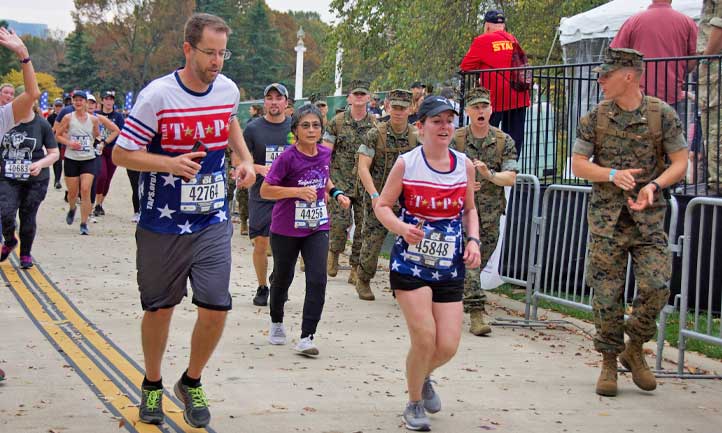 It was at my local TAPS Care Group that someone suggested I run with Team TAPS in memory of Dad. I was thrilled to raise awareness for TAPS while doing something I already loved. Scott and I signed up together to run the Marine Corps Marathon 10K. The actual event was much more than a race. I found fellow Team TAPS runners — though meeting for the first time, we all felt like friends that day. Nearing the end of the race, just as I noticed the finish line was coming up after an uphill, I spotted a line of Marines to my left. Marching up the hill in camouflage and boots and carrying rucksacks, their encouraging words gave me the boost I needed to climb the final hill. In a crazy sort of way, I could picture my dad standing at the top, clapping and cheering me on, too.