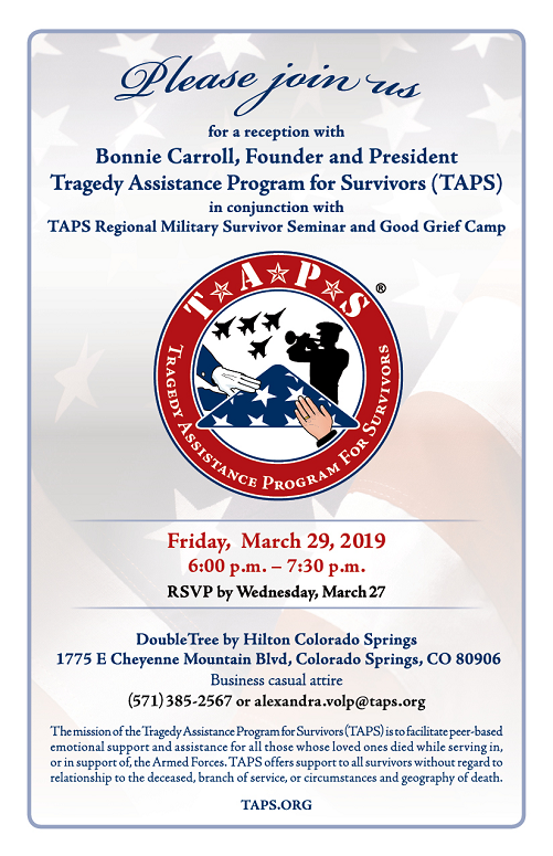 Please join us at a reception with Bonnie Carroll, TAPS President and Founder, held in conjunction with the TAPS Regional Military Survivor Seminar and Good Grief Camp