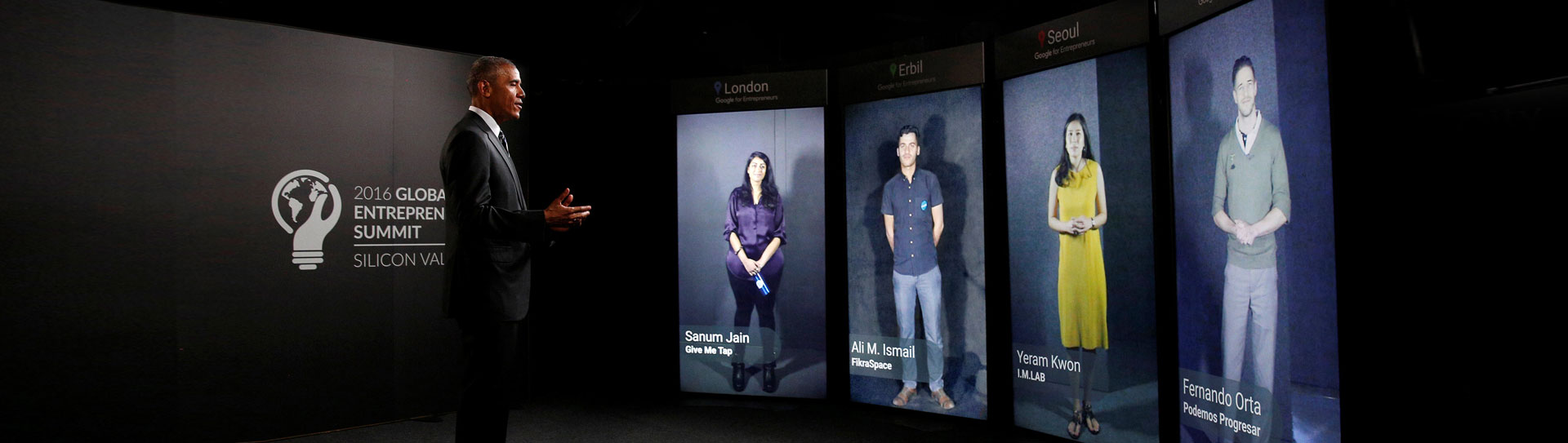 President Obama speaking to entrepreneurs in (from left to right) London, UK; Erbil Iraq; Seoul, South Korea; and Mexico City, Mexico through Portal_Screens at a Global Entrepreneurship Summit event hosted by Google for Entrepreneurs. Banner photo (above) from Shared Studios website.