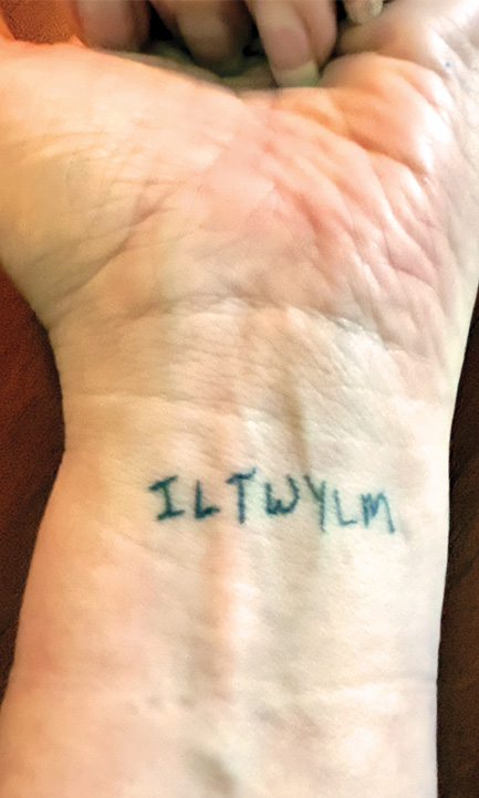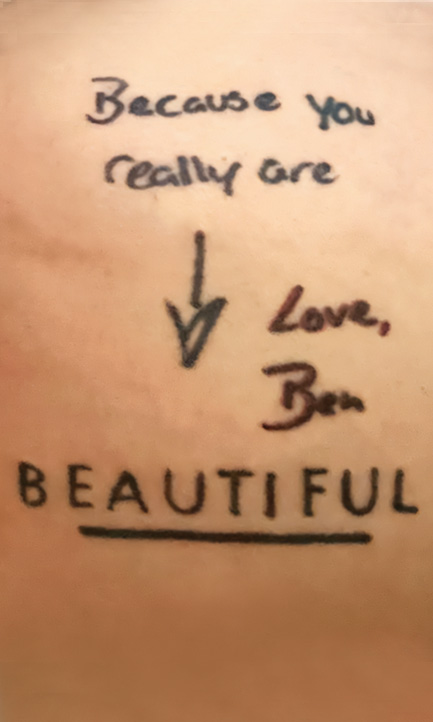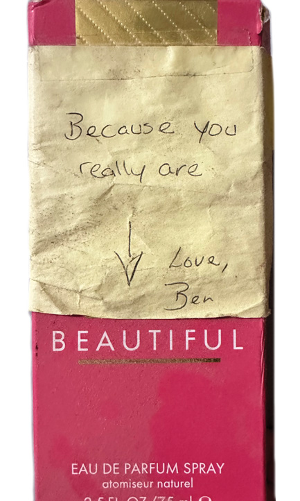 Kate Kastle memorialized a Post-It her husband left on her desk weeks before his death: “You’re my favorite. – Jake.” After a year together, Jolaine Locke’s husband bought her the perfume, Beautiful, and attached a sticky note above the label that read, “Because you really are.” Jolaine shared, “I don’t know why I kept it, but with all the moves, it never got damaged. Ben passed away after 17 years together, so I took the note in and got it tattooed.”