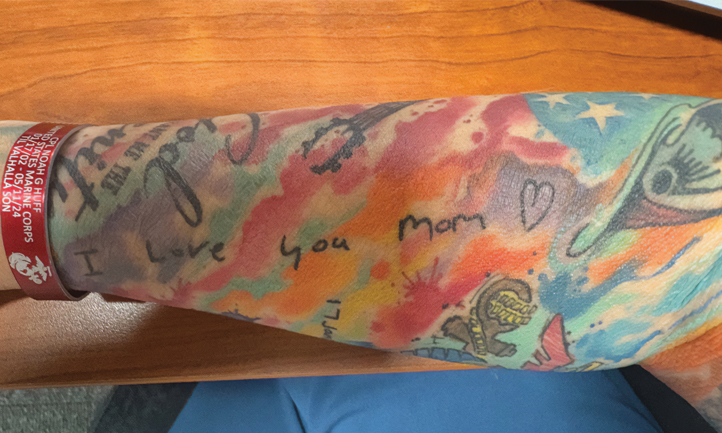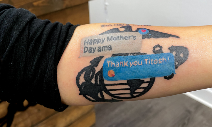 It’s not one of a kind, but Better Merritt Fry and her family have a four-of-a-kind tattoo on their arms: a replica of her son’s birthmark. Though it isn’t his handwriting, Ana Hernandez will forever be reminded of the last text message she received from her son. And a reminder doesn’t have to be written or typed. Diane Travis, her son, daughter, and four Marine brothers of Jason Lee Davis, Diane’s son, were all tattooed the night before Jason’s funeral with a Jack Daniel’s label recreation containing Jason’s details. Diane shared, “We live in a small town about 40 miles from the Jack Daniel’s distillery. This was a fact Jason told everyone.”