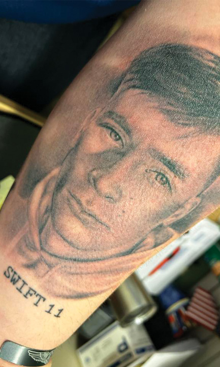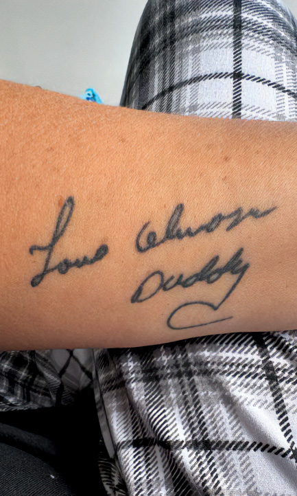 Few things are more unique than our loved one’s handwriting or fingerprint, making these tattoos truly one of a kind, and members of the TAPS Family have incorporated personal touches as a reminder of deep and lasting connection. Jennifer Allgaier bears “I love you and miss you,” the last thing her husband wrote to her. On Amy Farmer Bishop’s wrist is: ILTWYLM, short for I love the way you love me — how she and her husband signed everything.