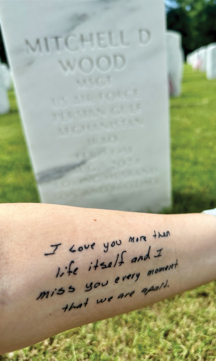 “I love you more than life itself and I miss you every moment that we are apart” — a line from a letter Courtney Wood received while her husband (then fiancé) was overseas. She explained, “After he passed, I found the letters and knew I wanted this on me forever. It reminds me every day of how much we loved each other.”