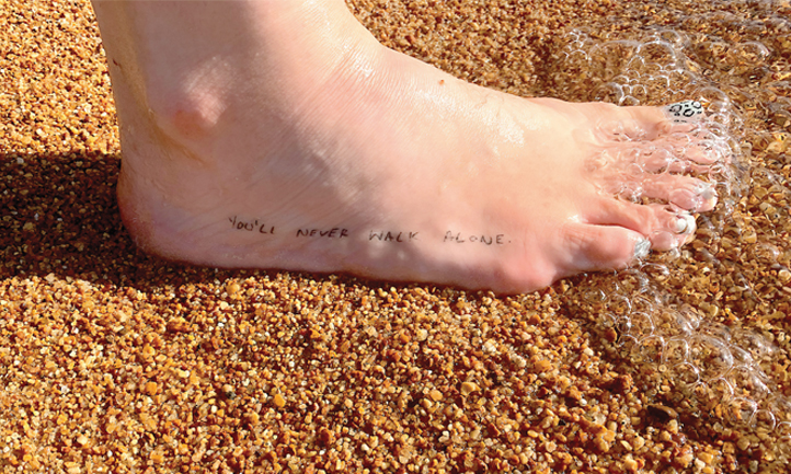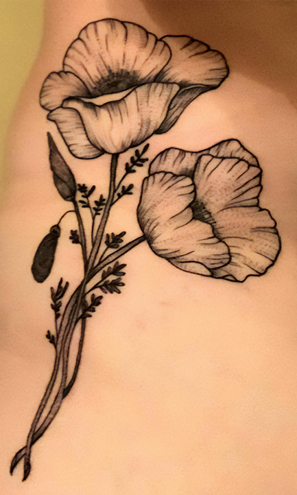 Lauren Buckland bears two unique tattoos: “You’ll never walk alone” in her husband’s handwriting, and a bouquet of four poppies — a tribute to their military connection. One of the poppies is a drooping bud holding her husband’s fingerprint. Michelle Marine incorporated her husband’s fingerprints by forming them into a heart-shaped tattoo.